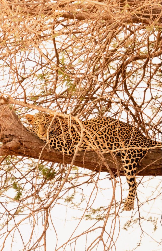 Es kam ein Anruf rein und wir fuhren weiter, da unser Guide hörte, dass ein Leopard gesichtet wurde. Als wir ankamen sahen alle hinauf, auf einen Baum der in weiter ferne war. Unser Guide hatte seine ganz eigene Technik um die Tiere zu sehen. Er nahm ein Fernglas und hielt sein Handy davor, so konnte er auf dem Display die Tiere in perfekter nähe betrachten und uns genau sagen wo sich das Tier befand. Wir hatten zum Glück ein Teleobjektiv dabei und konnten das Tier durch die Kamera sehen. Der Leopard lag gemütlich auf einem Ast und ließ sich von uns nicht weiter stören.